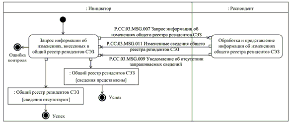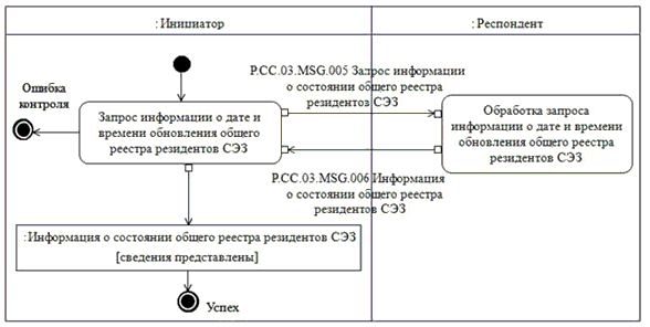 Запрос информации о дате и времени обновления общего реестра резидентов СЭЗ выполняется уполномоченным органом государств-членов, запрашивающим сведения, в целях оценки необходимости синхронизации хранящихся в информационной системе уполномоченного органа государства-члена, запрашивающего сведения, сведений о юридических лицах, включенных в общий реестр резидентов СЭЗ, со сведениями о юридических лицах, содержащимися в общем реестре резидентов СЭЗ и хранящимися в Комиссии. При осуществлении запроса информации о дате и времени обновления общего реестра резидентов СЭЗ выполняется процедура "Получение информации о дате и времени обновления общего реестра резидентов СЭЗ" (P.CC.06.PRC.004).