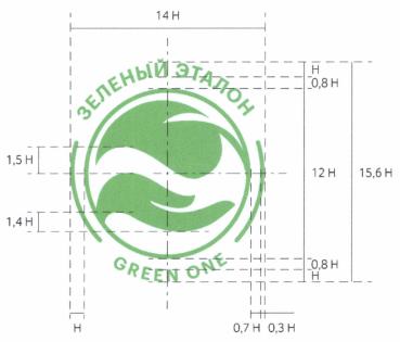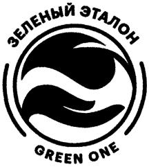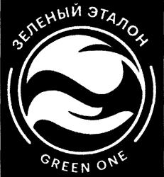 Над окружностью под наклоном располагается словесный элемент "ЗЕЛЕНЫЙ ЭТАЛОН" (на русском языке), выполненный заглавными кириллическими буквами зеленого цвета. Под окружностью под наклоном располагается словесный элемент "GREEN ONE", выполненный заглавными латинскими буквами зеленого цвета.