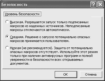 - Выберите пункт Параметры в меню Сервис, выберите вкладку Безопасность, нажмите кнопку Безопасность макросов и установите уровень безопасности - Средний.