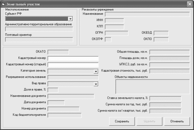 После этого работа идет аналогично вводу информации. После внесения изменения нажмите кнопку "Сохранить". Для удаления информации о земельном участке в режиме редактирования нажмите кнопку "Удалить"