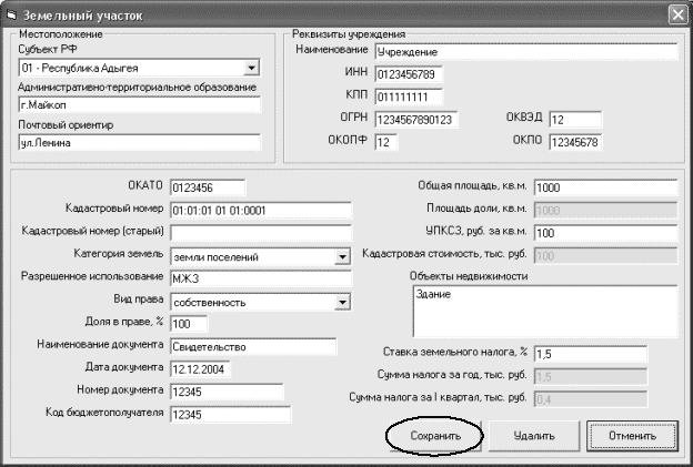 Для запоминания информации о земельном участке нажмите кнопку "Сохранить"
